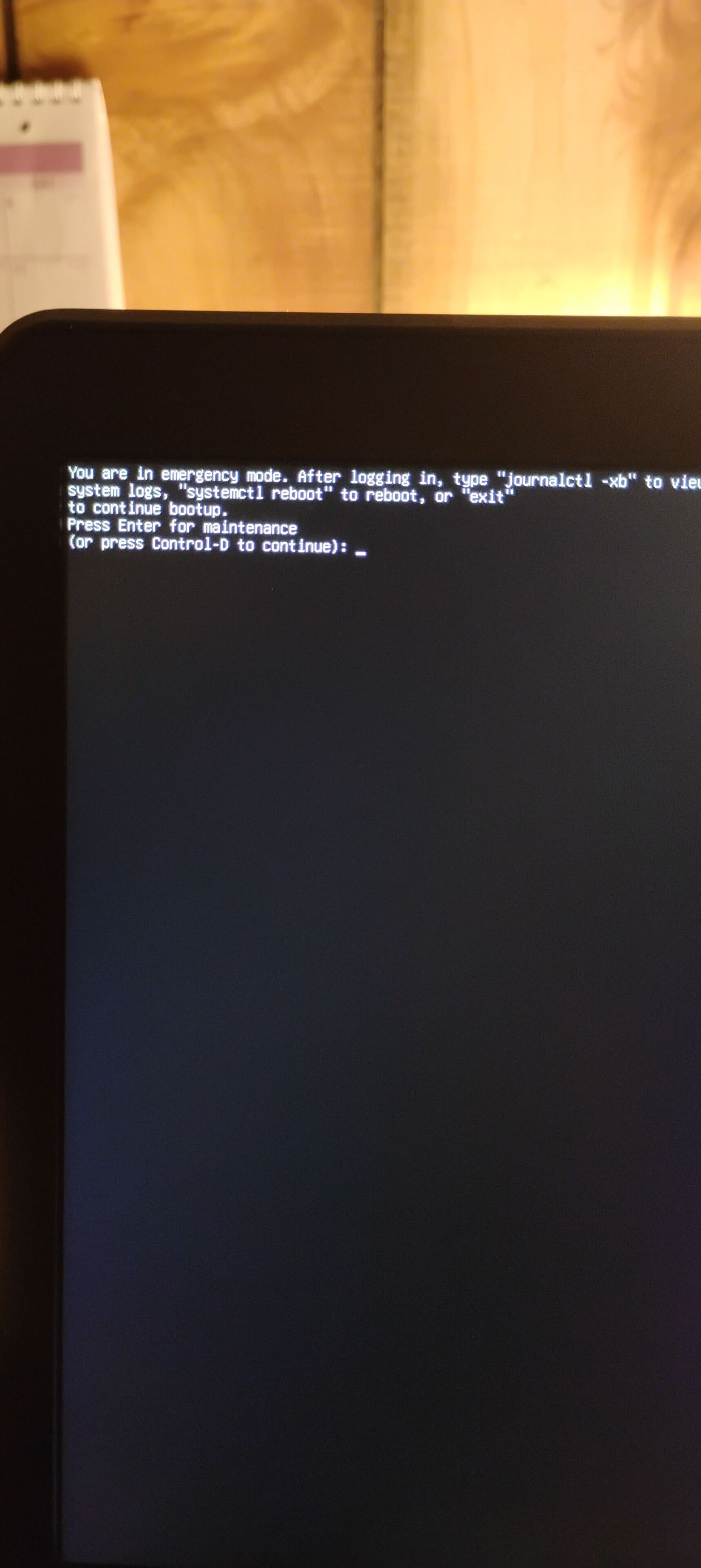 Doing Ctrl-D allowed to boot into the desktop but it to took quite a bit of time.