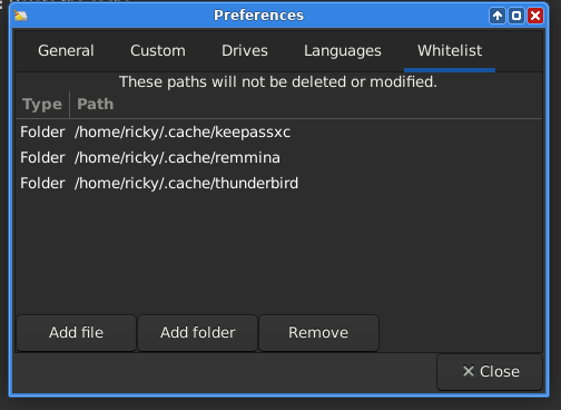 The problem freeing space with software Bleachbit is I was losing some important information, so lately I went deep on this and I discovered in Bleachbit configuration there’s a whitelist section, where you can configure folders you don’t want to being deleted by the software.
