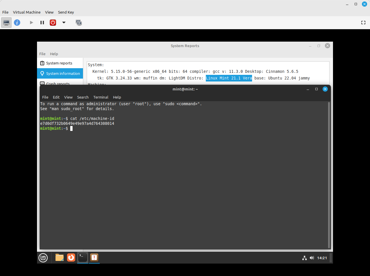This confirms that I have made no changes and that Linux Mint uses a ‘standardized’ value, at least for this version and edition of Linux Mint (not Debian Edition). To clarify, I am seeing the same “machine-id” on both QEMU-KVM guests and real iron. Additionally, the same “machine-id” is seen on multiple instances of real iron. Linux Mint appears to be following a similar methodology to Whonix.