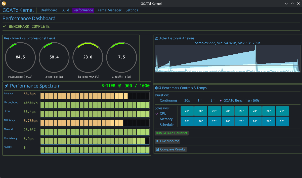 Using a modern LLVM and Clang toolchain, it gives you a streamlined workspace to take full control of your system’s “brain.” But it’s not just a build tool, it’s also a diagnostic suite. I wanted users to be able to actually see the impact of their changes. With integrated live monitoring and built in benchmark, you can benchmark your build in real time, moving the kernel compile process from a “black box” into something more transparent and manageable for everyone.