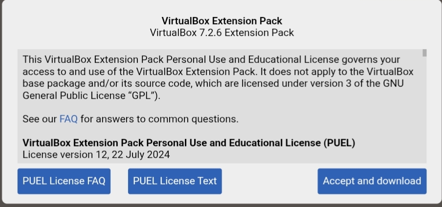Make sure you select accept and download, you have to note your virtual box version, and look for the appropriate extension pack with your virtual box version