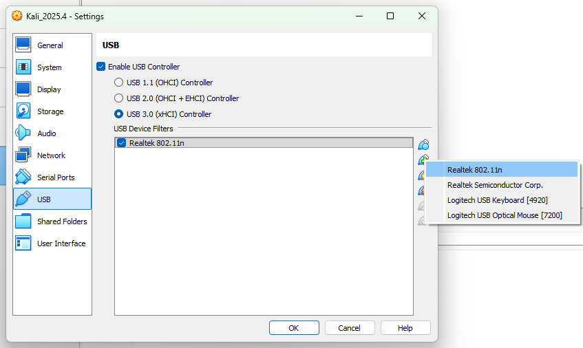 I want practice wireless hacking lab with aircrack-ng. how can i add wi-fi feature for my kali linux. I have one usb wifi adapter which is connected to physical computer( which is already having ethernet adapter).