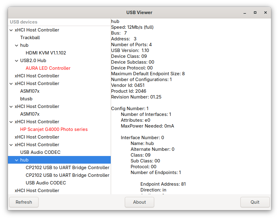 Finally had time to capture images to upload. Here’s the view using USB Viewer - my ham radio has the devices listed under the highlighted “hub” entry.
