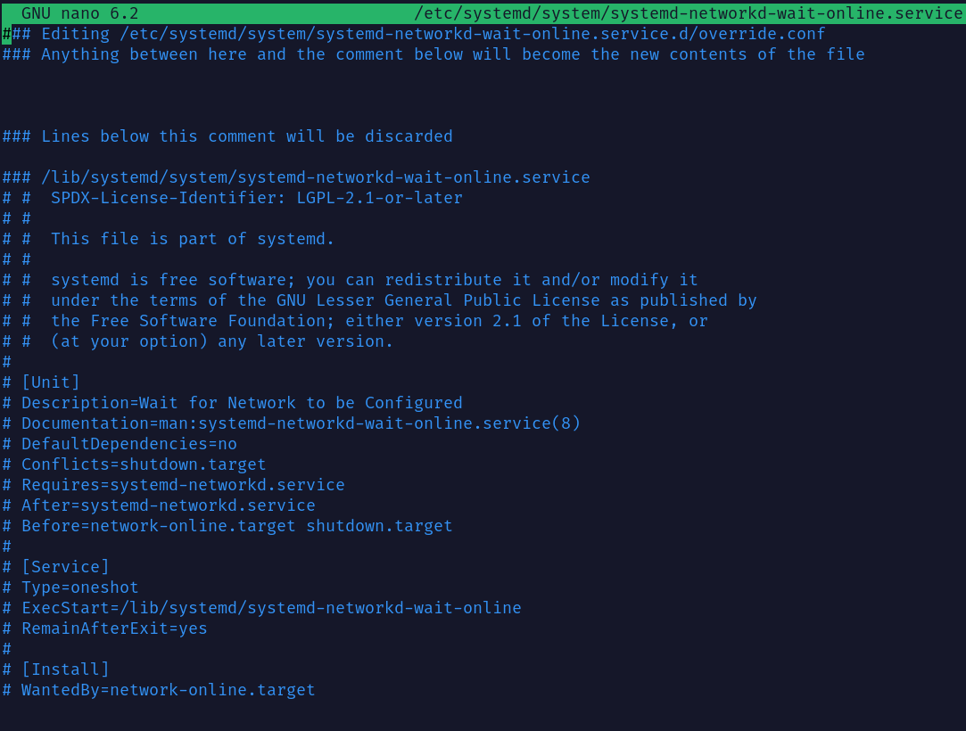I followed the article through with no luck, nothing seems to stop the timeout… oddly, when I use the command “systemctl edit systemd-networkd-wait-online.service” the system doesn’t seem to retain my changes which might account for my inability to stop the timeout i.e. I use that command and then if I use it again (immediately) I can’t see any of the changes I made.