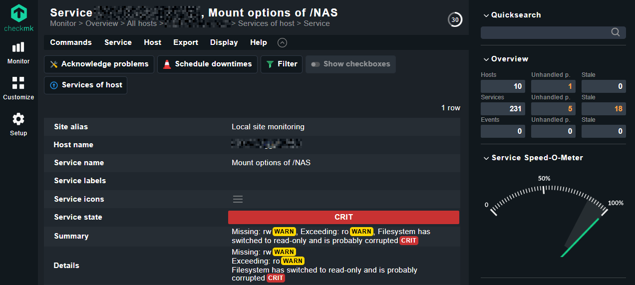 I have not logged into Checkmk for several weeks, and the display screen above my rack has been off because I removed it to make some changes. (wishing now I had gone with a rolling network rack) But when I did login today, I immediately noticed a CRIT alert on a NAS mount that had flipped to read-only: