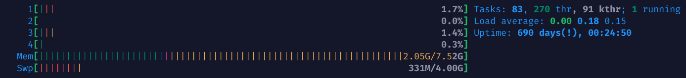 690, is long but I’ve seen much longer. It’s rarely a number to be proud of, but often a good sign of the underlying distro’s stability if in active use.